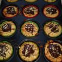 Erst Förmchen mit Teig füllen (ca 2/3 von jedem Förmchen), dann Topping drauf und ab damit in den Ofen 🙂