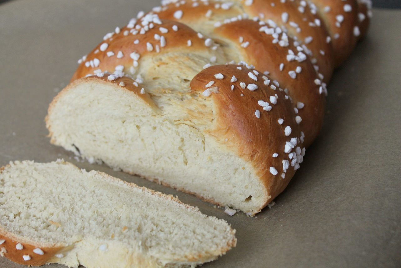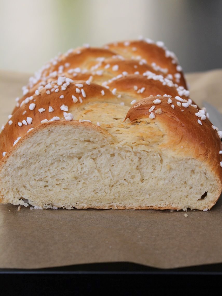 - Den Hefezopf auf ein Backblech (Backpapier nicht vergessen) legen und nochmals 30 Minuten gehen lassen. Mit lauwarmer Pflanzenmilch bestreichen und nach Wunsch dick mit Hagelzucker oder Mandelstückchen verzieren.