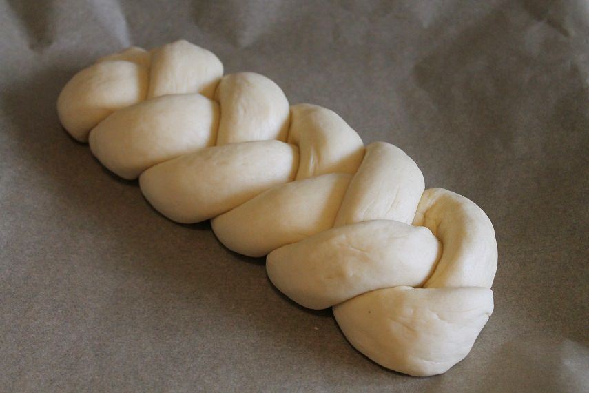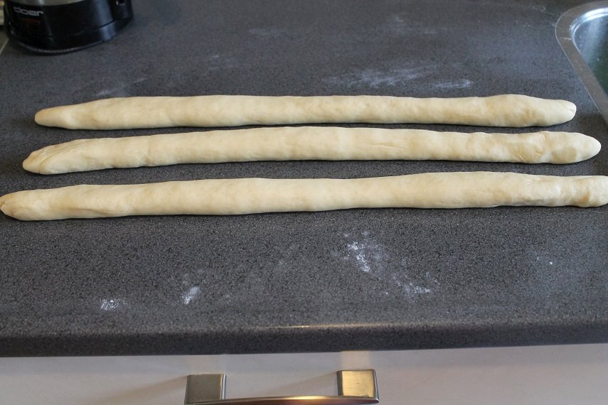 - Den Teig in drei oder vier Teile unterteilen. Aus diesen 3 / 4 Teilen formt man Stränge und flechtet diese wie man es halt vom Hefezopf kennt.