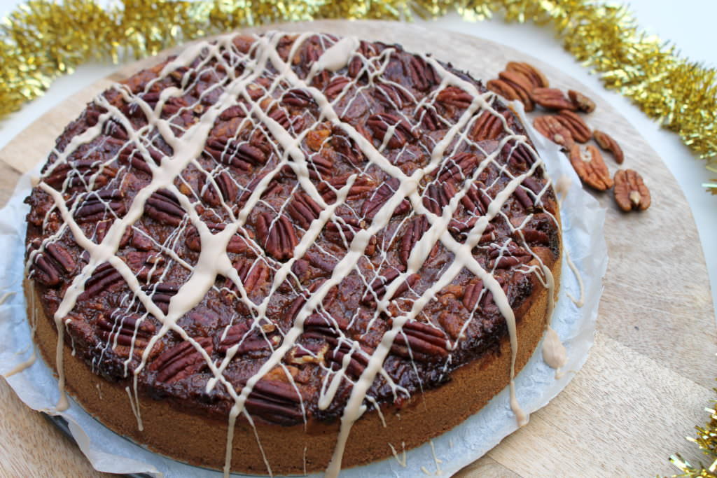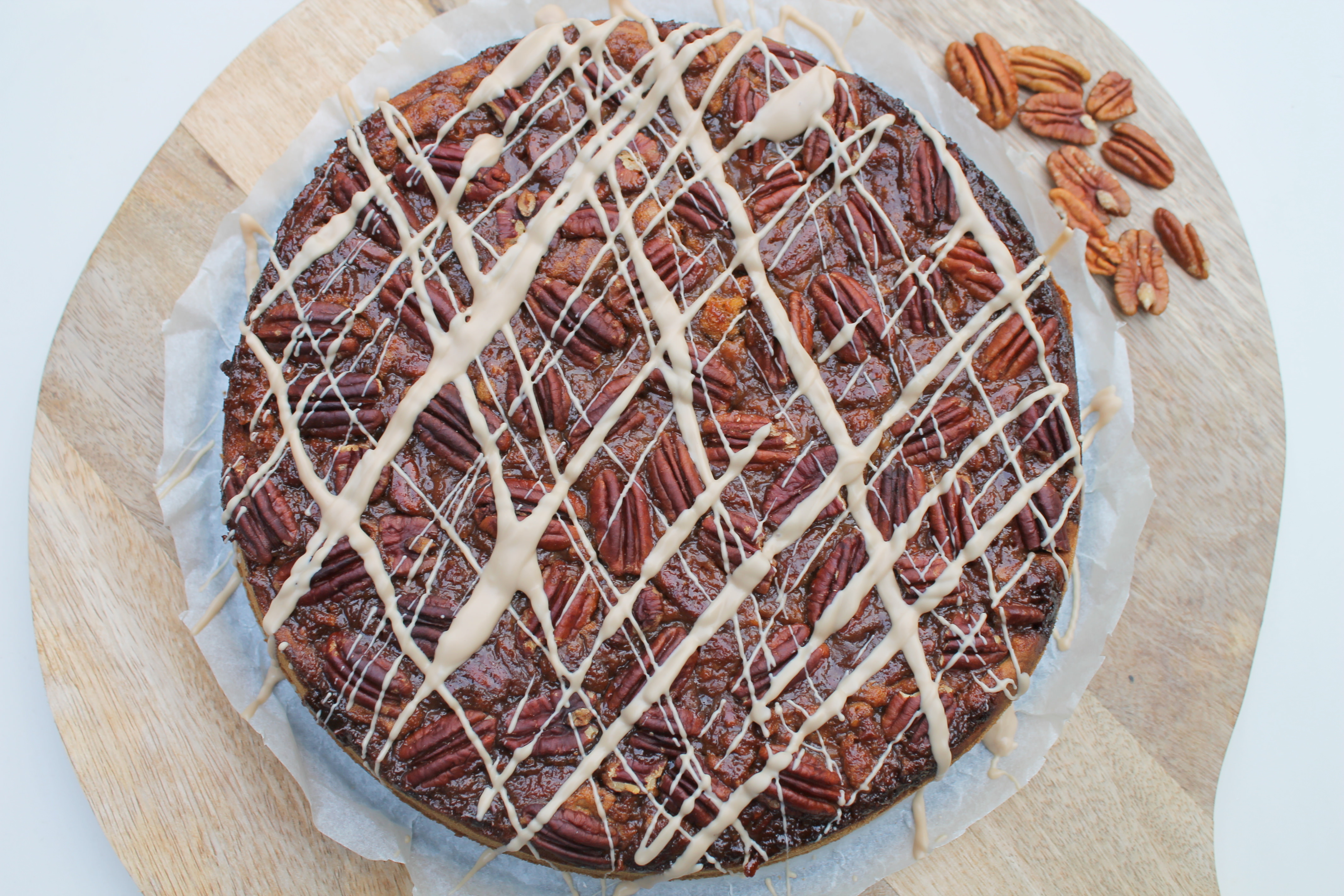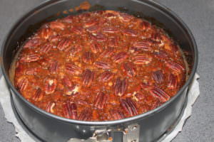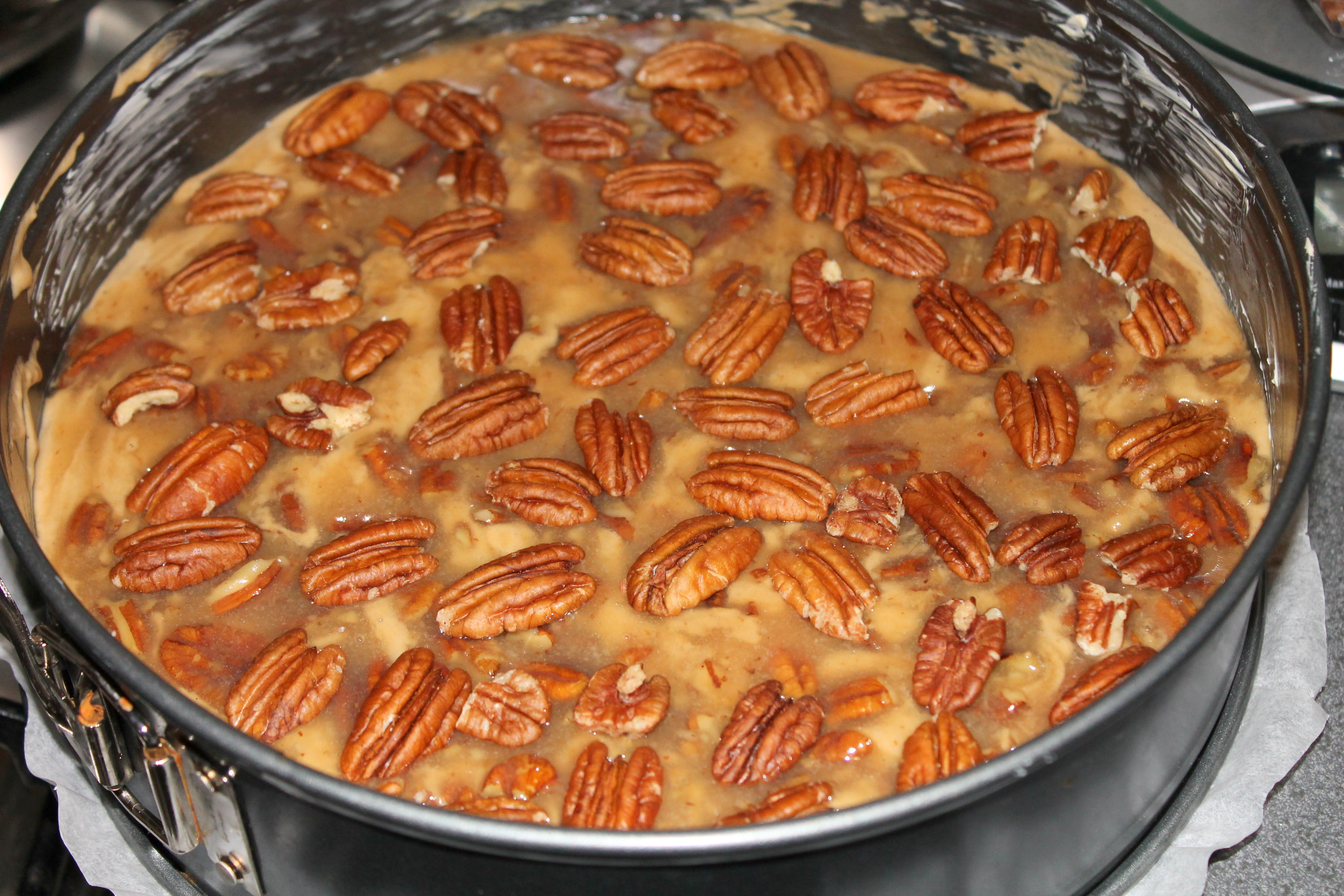 - Das Karamell auf dem Teig verteilen. Muss absolut nicht gleichmäßig sein. Mit den restlichen 70 g Nüssen verzieren. Ich habe die Pekannüsse einfach hübsch ins Karamell gedrückt.
