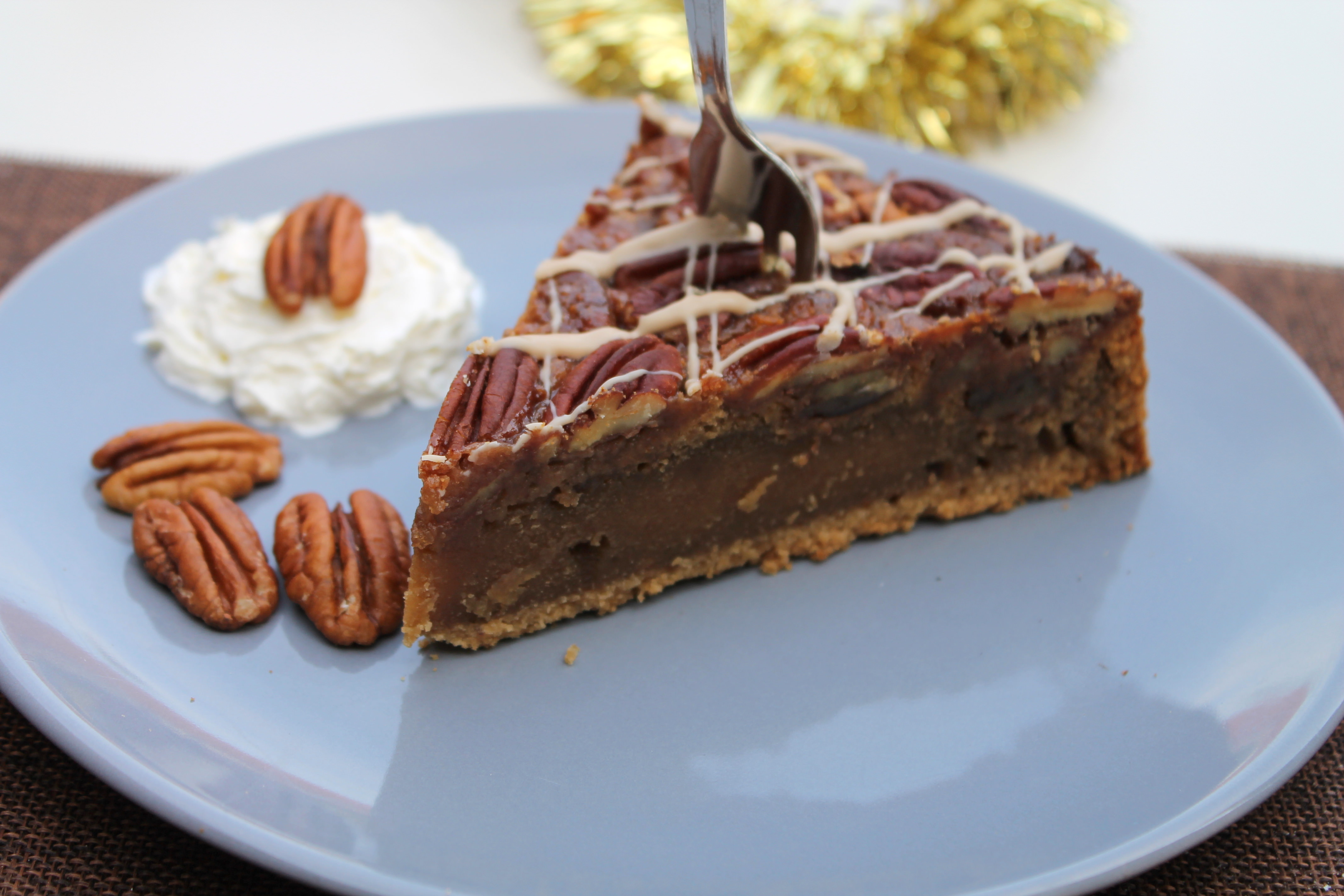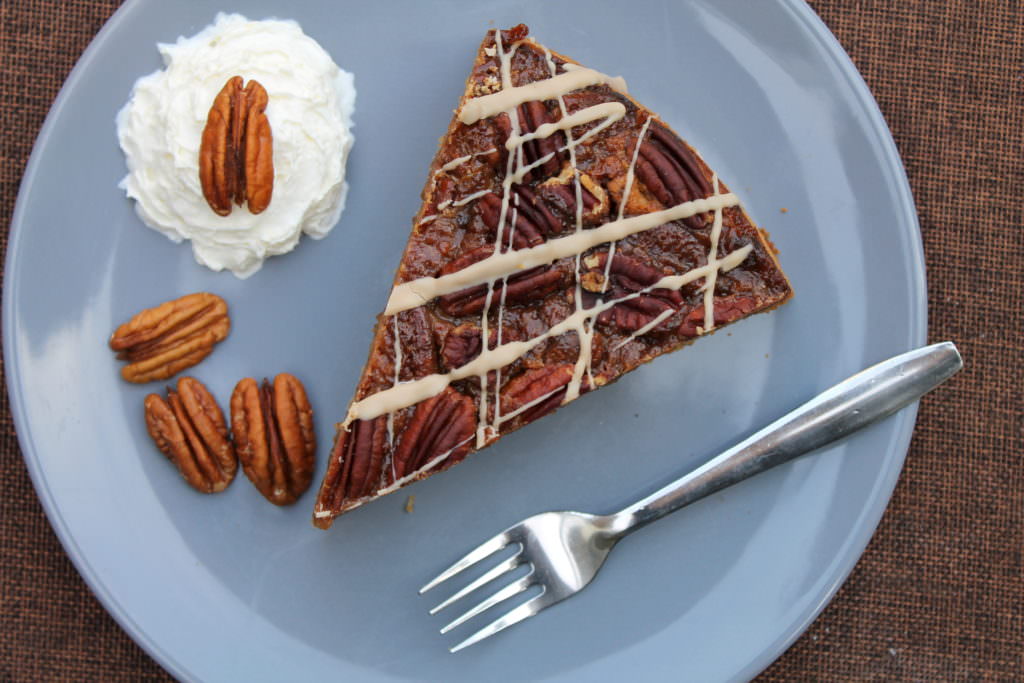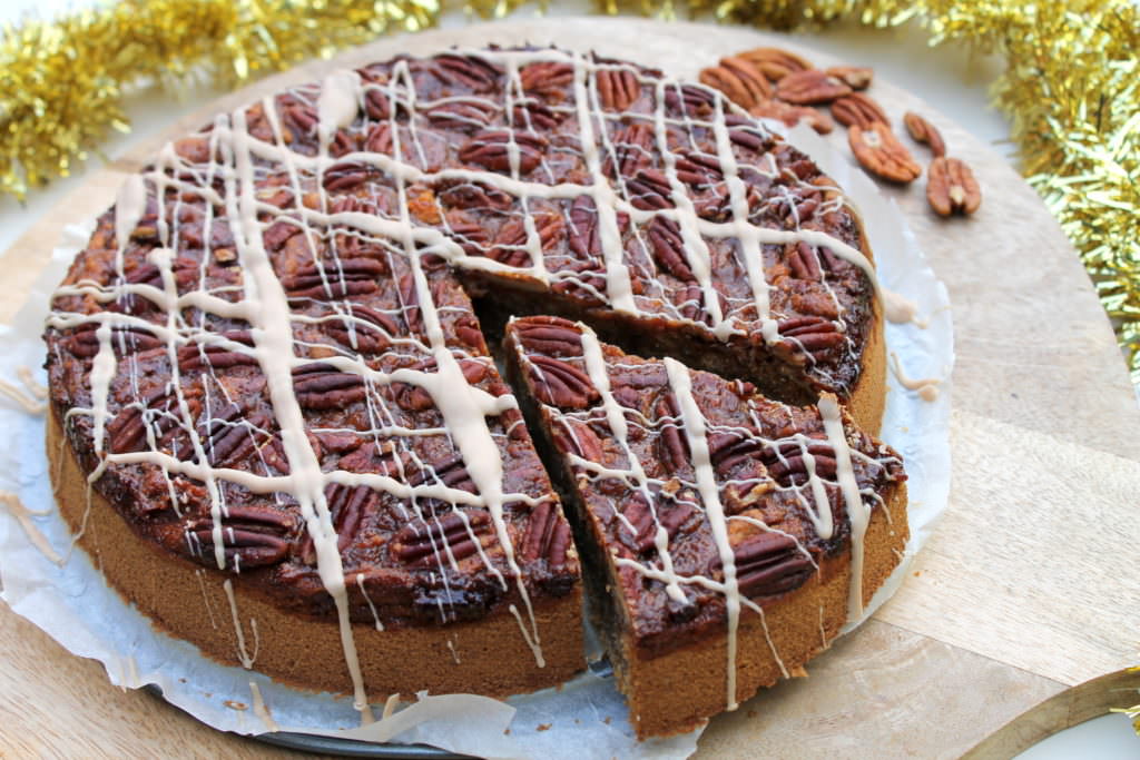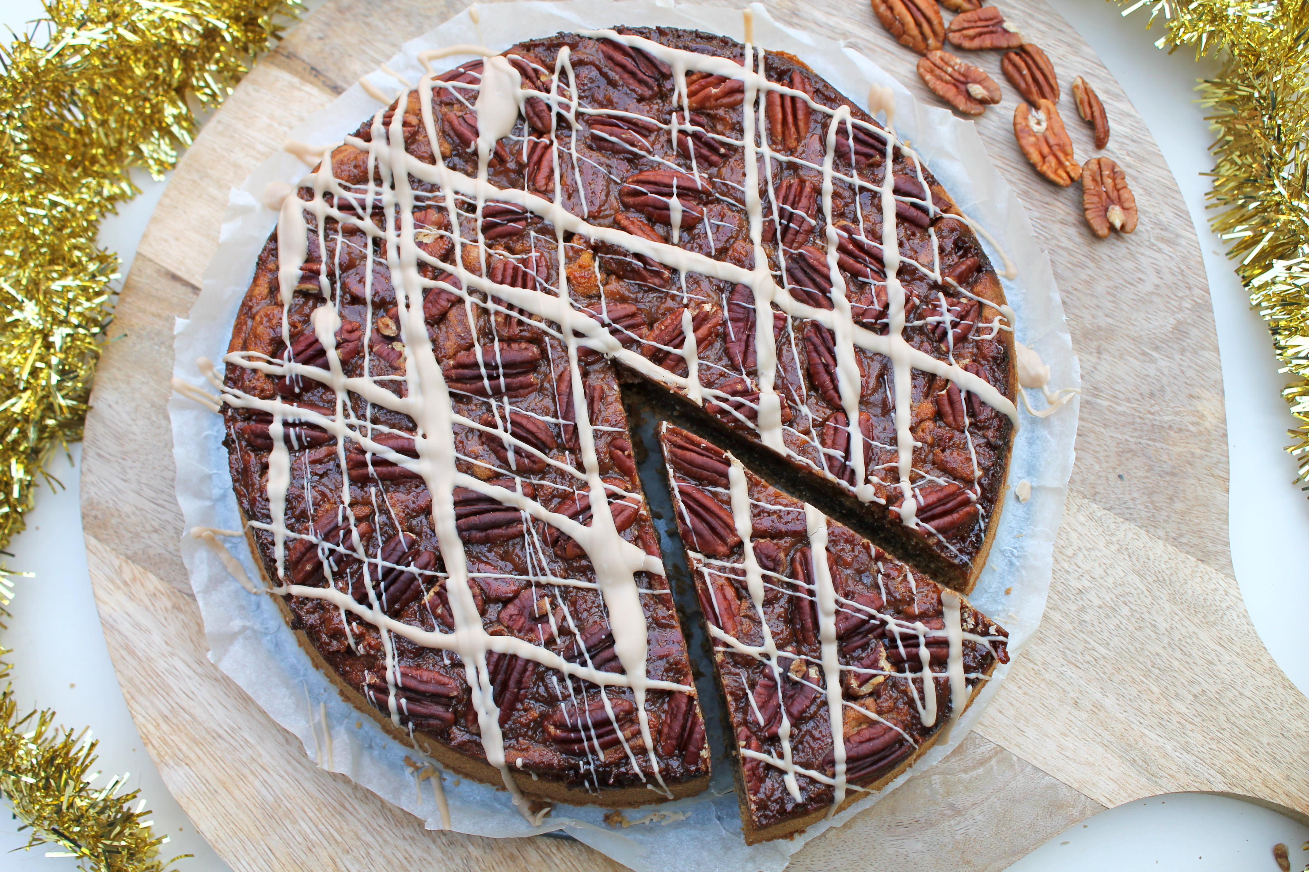 - Das Karamell auf dem Teig verteilen. Muss absolut nicht gleichmäßig sein. Mit den restlichen 70 g Nüssen verzieren. Ich habe die Pekannüsse einfach hübsch ins Karamell gedrückt.