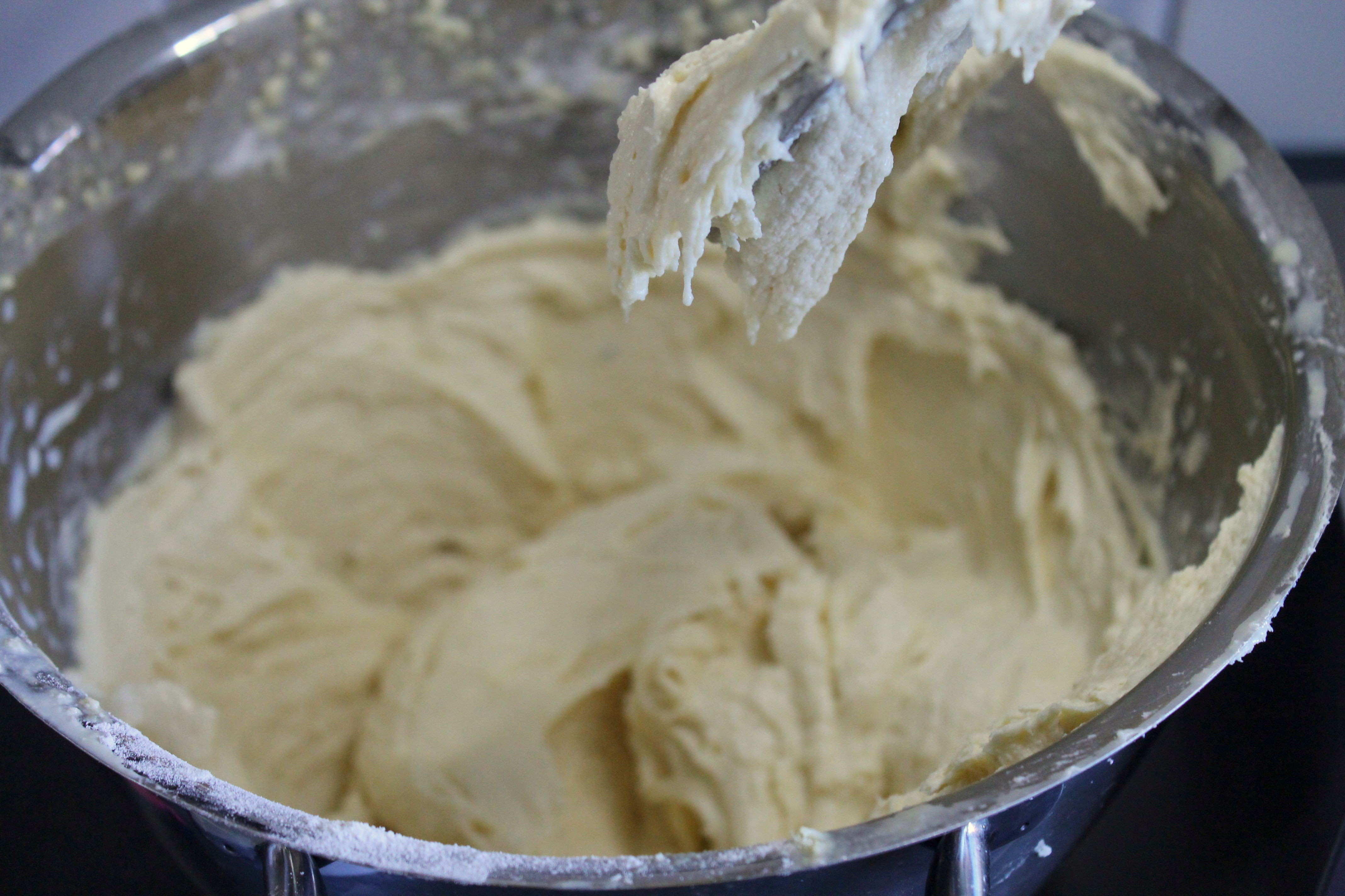 - Backpulver und Mehl hinzugeben und den Teig wieder gründlich vermischen. Der Teig sollte nun fest sein. Wenn man ihn mit 2 Löffeln auseinander zieht, sollte er reißen. Falls der Teig zu trocken ist, einfach mehr Pflanzenmilch hinzugeben und falls der Teig zu flüssig ist, dann einfach etwas mehr Mehl hinzugeben.
