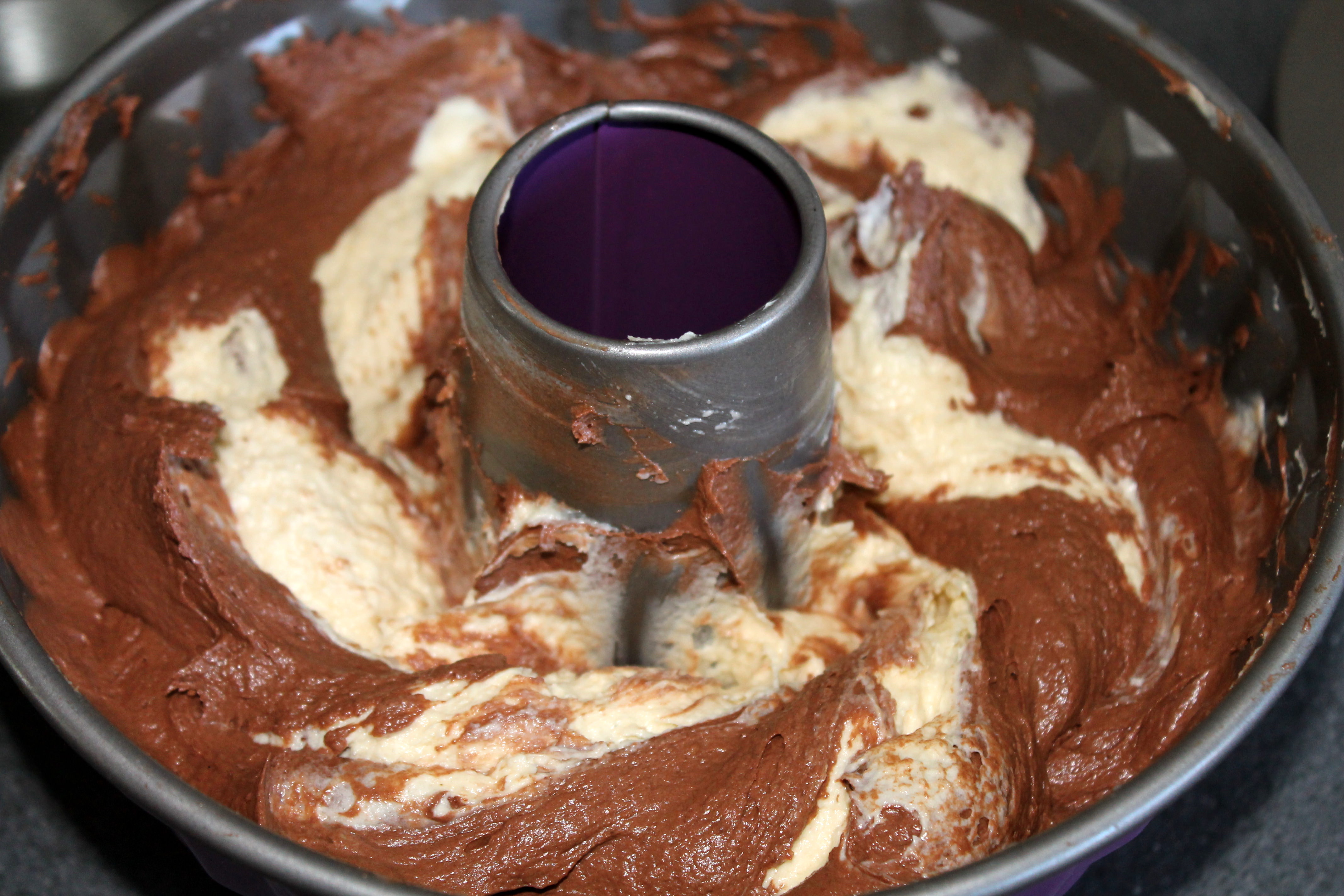 - Die Teige mit einer Gabel so vermischen, dass der Kuchen nach dem Backen beim Anschneiden ein hübsches Muster hat (Spiralförmig durch den Teig ziehen).