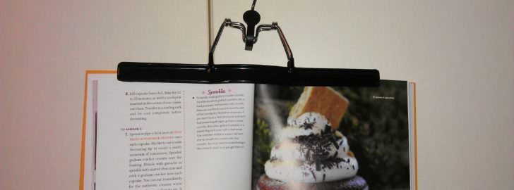 So klappen weder die Seiten zu, noch werden sie dreckig. Außerdem liegt so nichts im Weg. Und das Buch hängt auch noch auf Augenhöhe 🙂
