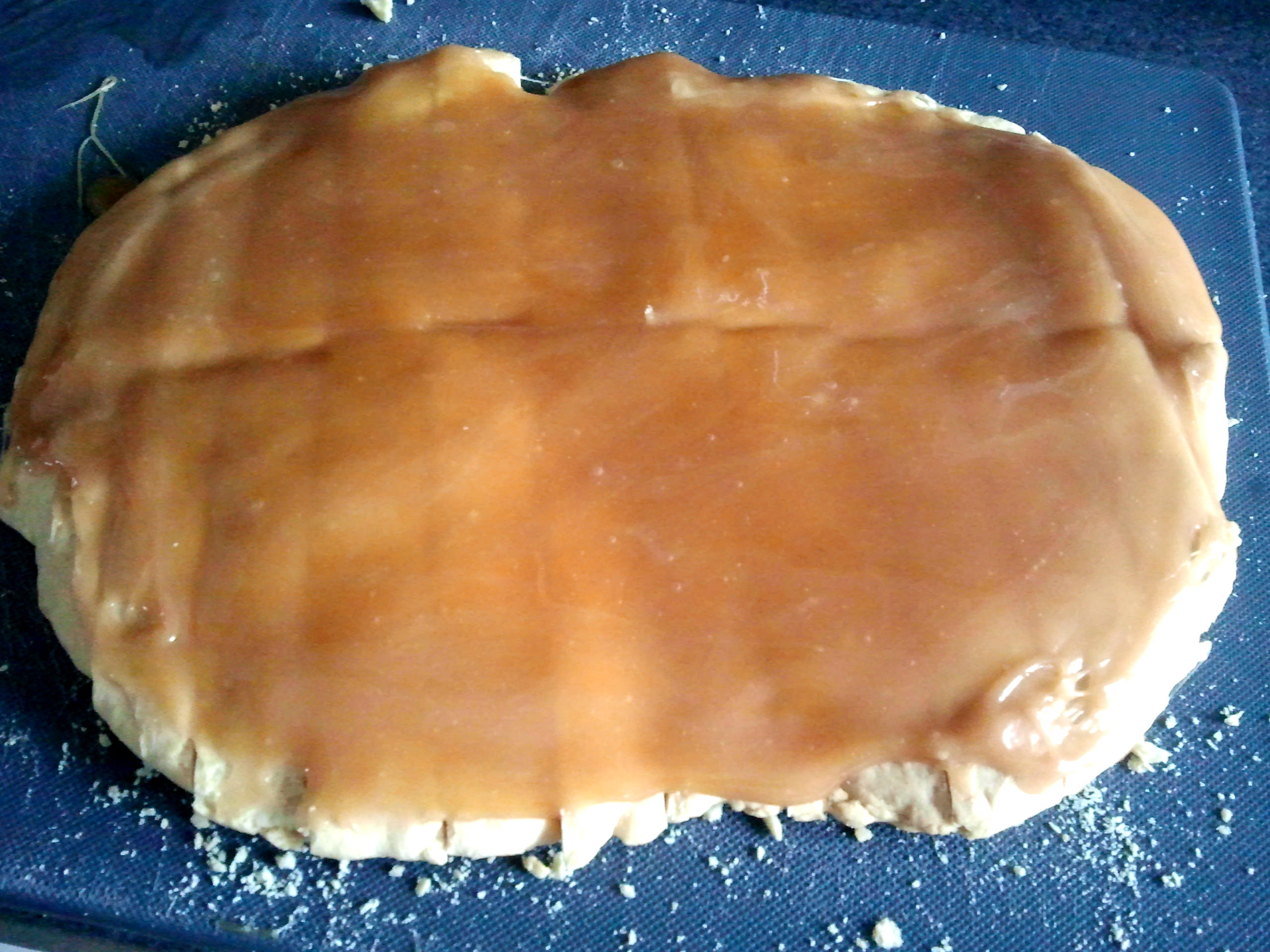 - Teig auf 2-3mm (ich hatte 4 mm, leider zu dick!)dünn ausrollen (am besten gleich auf dem Backpapier ausrollen), möglichst eckig/ nicht rund, so bekommt man am Ende weniger runde Randstücke. Wer mag kann den Teig jetzt schon mal vorschneiden. Die geschnittenen Kekse aber nicht auseinanderlegen, sondern wieder zusammenlegen. Das erleichtert später das draufschmieren vom Karamell, dieser kann dann nicht an den Seiten runterlaufen und man kann alle ‚Twix‘ auf einmal bestreichen.
