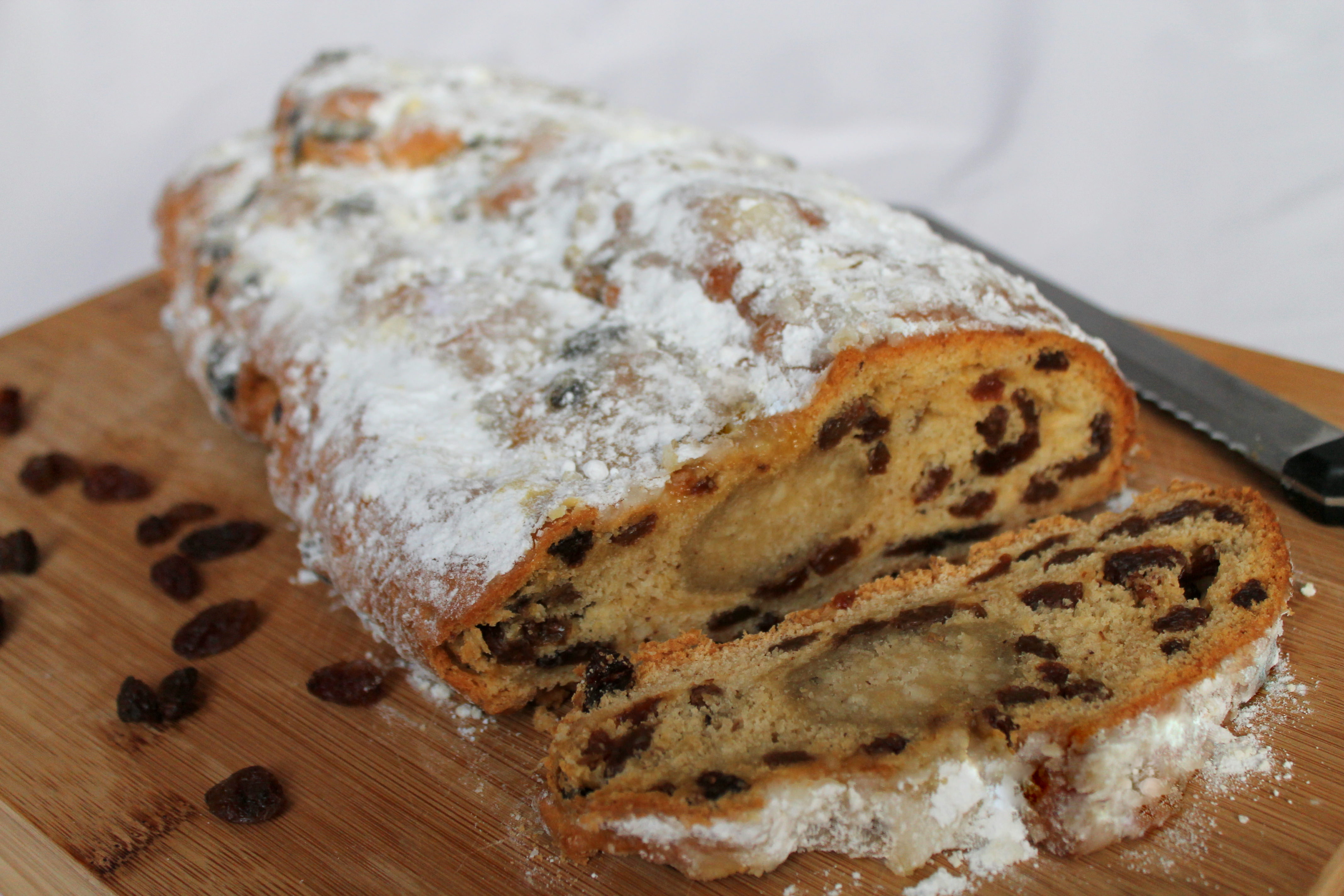 Hier habe ich den Stollen auch noch ohne Rosinen gebacken. Klappt prima.